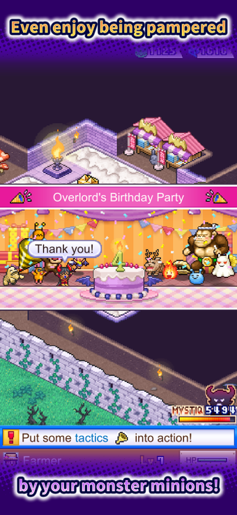 성 관리 외에도 플레이어는 몬스터를 인근 던전과 마을로 탐험 보내 아이템을 수집하고 새로운 동맹을 만날 수 있습니다. 이 게임은 몬스터의 능력을 향상시키기 위해 몬스터를 결합할 수 있는 융합 메커니즘도 도입합니다. 최면 가스 및 양동이와 같은 옵션을 포함한 효과적인 함정 배치는 모험자 공격을 저지하는 데 중요한 역할을 합니다. 야망 있는 어둠의 군주들은 모든 모험자를 정복하고 왕국을 지배하기 위해 방어력을 전략적으로 개발해야 합니다.